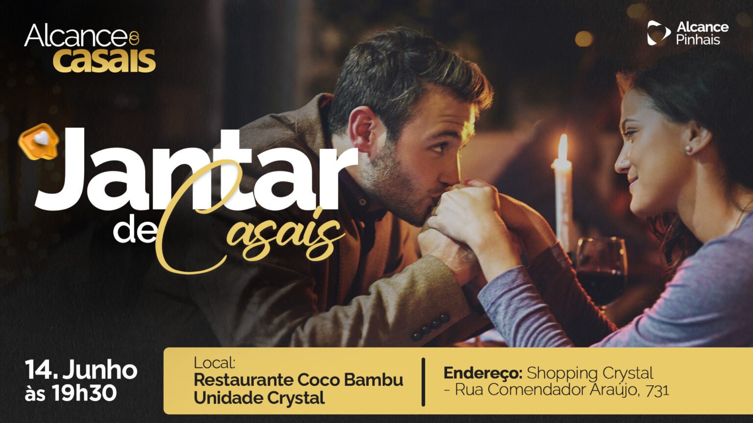 O nosso aguardado Jantar de Casais está se aproximando! Nesta edição, teremos o prazer de recebê-los no restaurante Coco Bambu, Unidade Crystal. Garanta sua presença fazendo sua inscrição agora mesmo. Não perca esta oportunidade de desfrutar de uma noite especial e inesquecível!